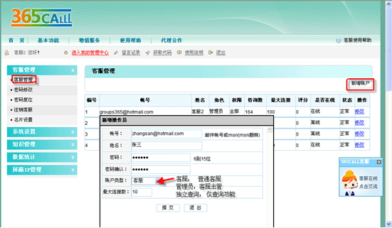 輕松管理網(wǎng)站的客服成員。 登錄kf000在線客服系統(tǒng)網(wǎng)站,進(jìn)入管理中心,點擊“客服管理”,可“新增賬戶”進(jìn)行添加客服: