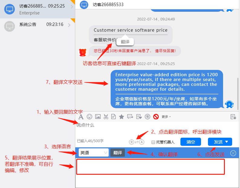 在接待不同語言的訪客時,可將訪客消息及發(fā)送文字翻譯為指定語言,目前支持英、法、日、韓、俄等語言。